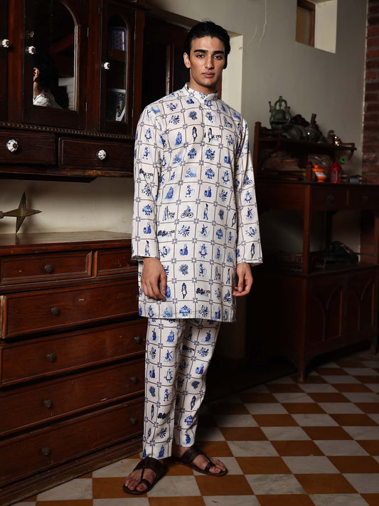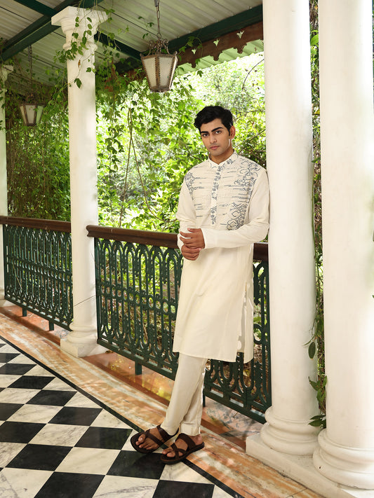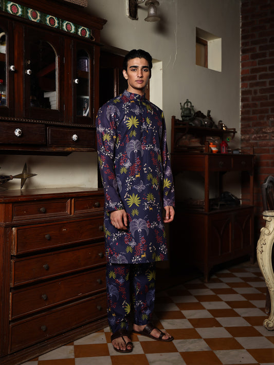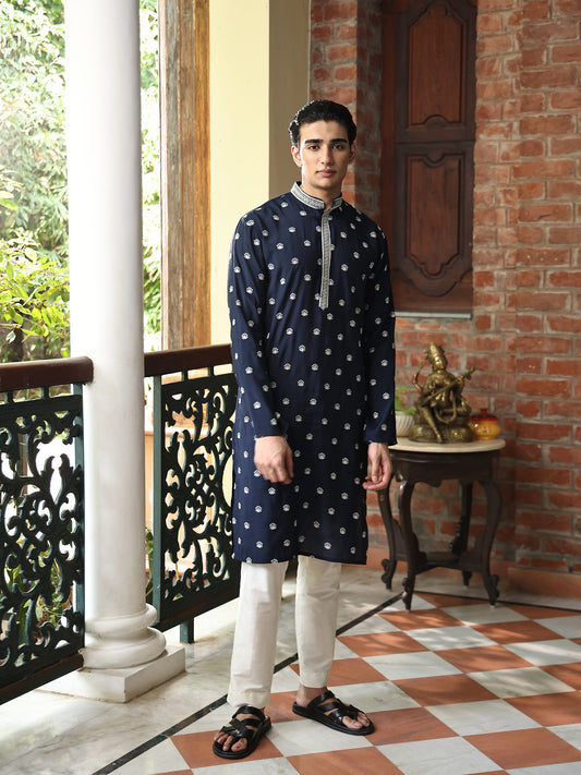 Basil Blue Embroidered Cotton Blend Kurta Set