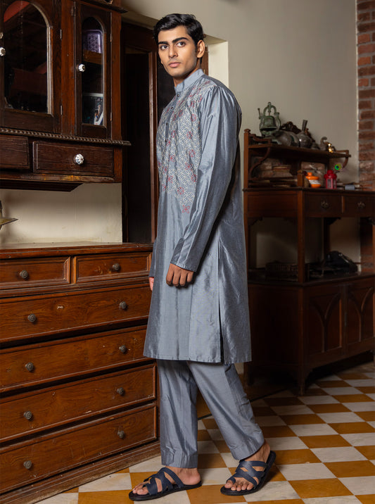Dheer Gray Embroidered Katan Kurta SetRegular price Rs. 8,534Regular priceUnit price / perRs. 11,379Sale price Rs. 8,53440%
