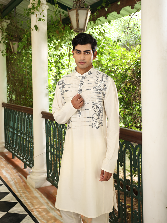 Chinmay Ivory Embroidered Katan KurtaRegular price Rs. 1,923Regular priceUnit price / perRs. 3,205Sale price Rs. 1,92340%