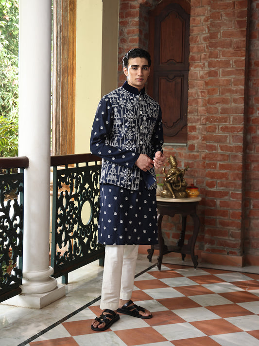 Tapan Blue Cotton Blend Embroidered Bundi SetRegular price Rs. 5,628Regular priceUnit price / perRs. 9,380Sale price Rs. 5,62840%