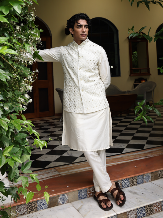Amos Ivory Cotton Blend Embroidered Bundi SetRegular price Rs. 5,697Regular priceUnit price / perRs. 9,495Sale price Rs. 5,69740%