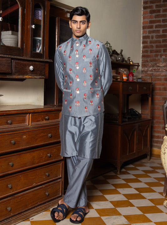 Kaziah Grey Katan Embroidered Bundi SetRegular price Rs. 6,198Regular priceUnit price / perRs. 10,330Sale price Rs. 6,19840%