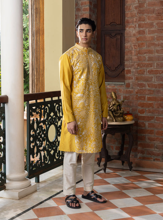 Govind Yellow Embroidered Katan Kurta SetRegular price Rs. 4,332Regular priceUnit price / perRs. 7,220Sale price Rs. 4,33240%