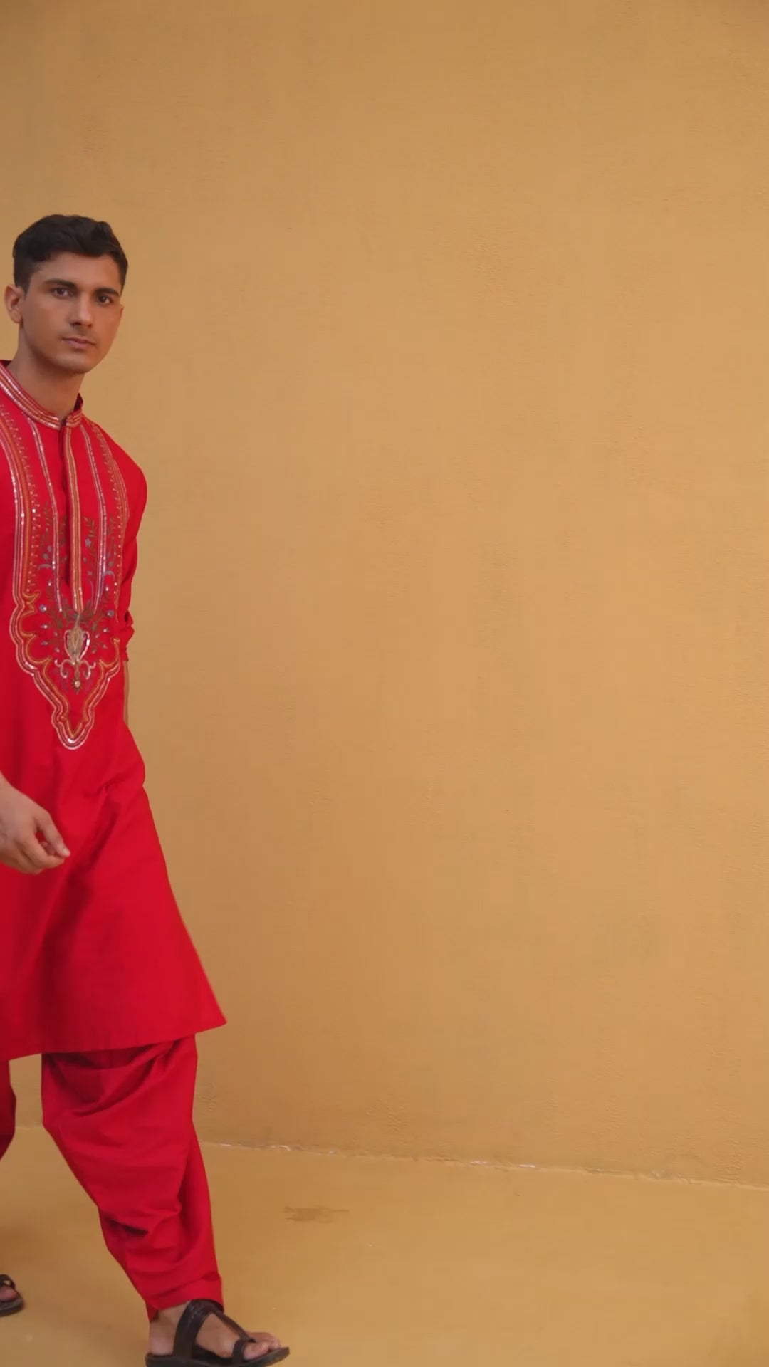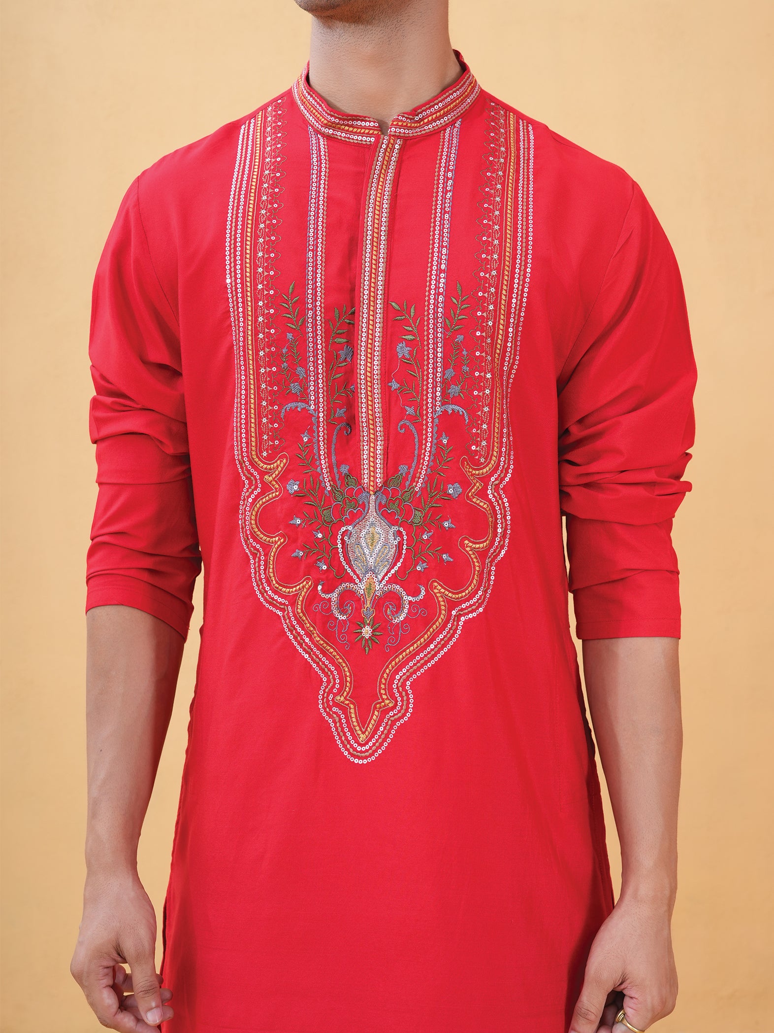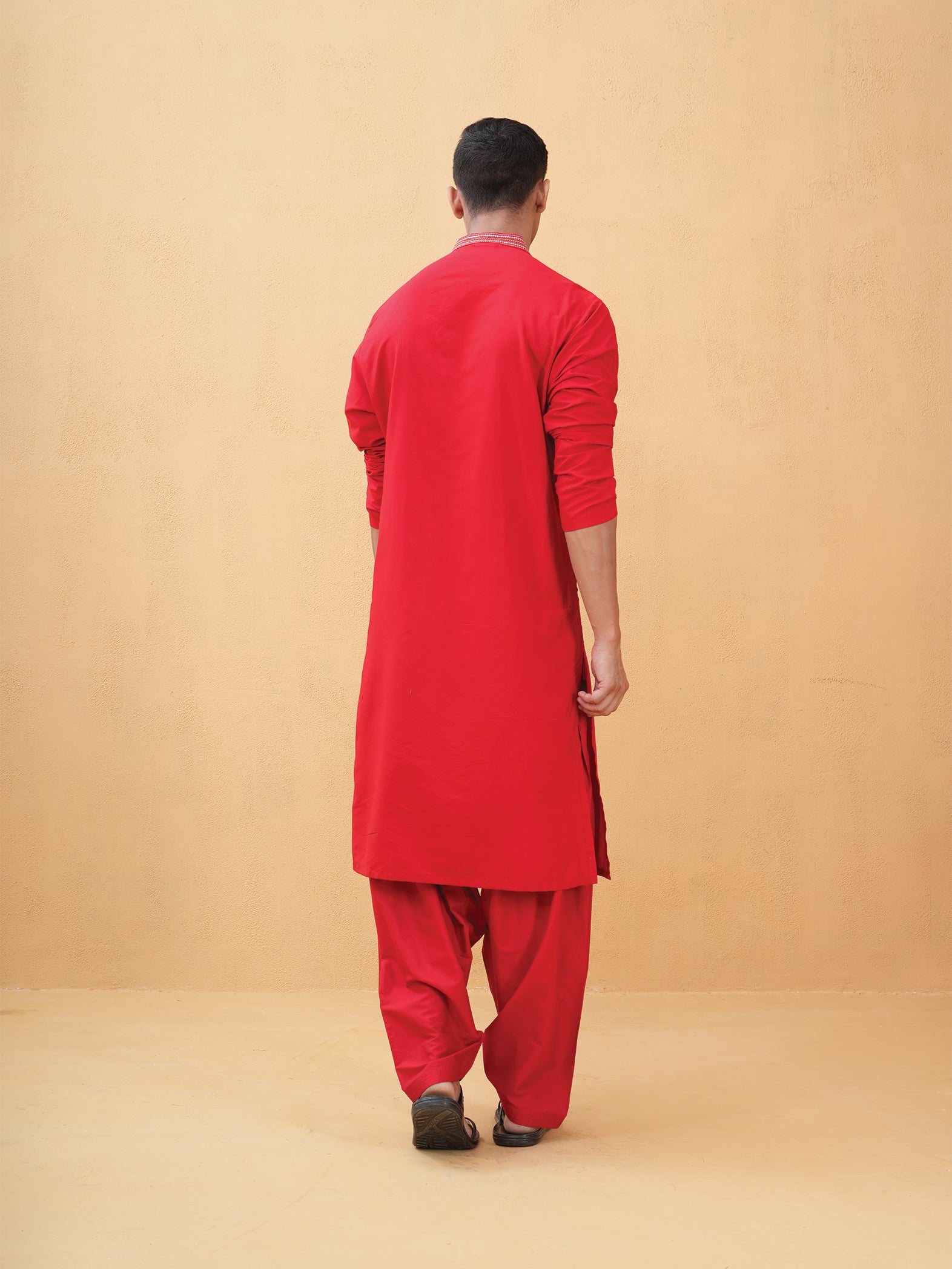 A striking red kurta crafted in luxurious Katan silk, exuding timeless charm.