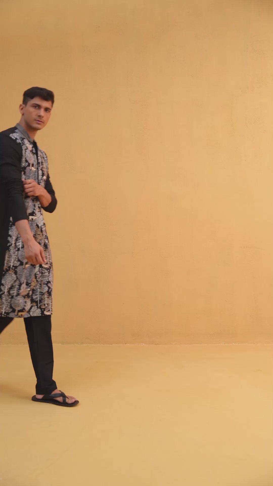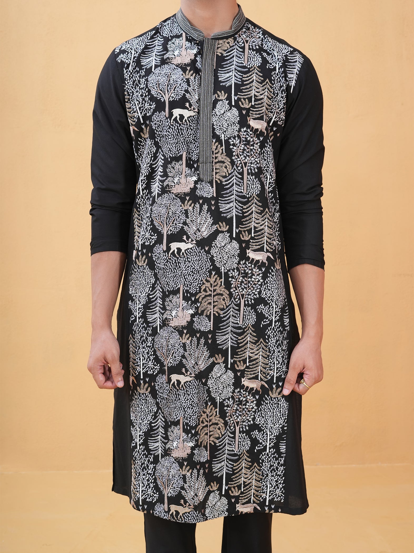 An elegant black Katan silk kurta set featuring subtle tonal embroidery that celebrates refined craft.