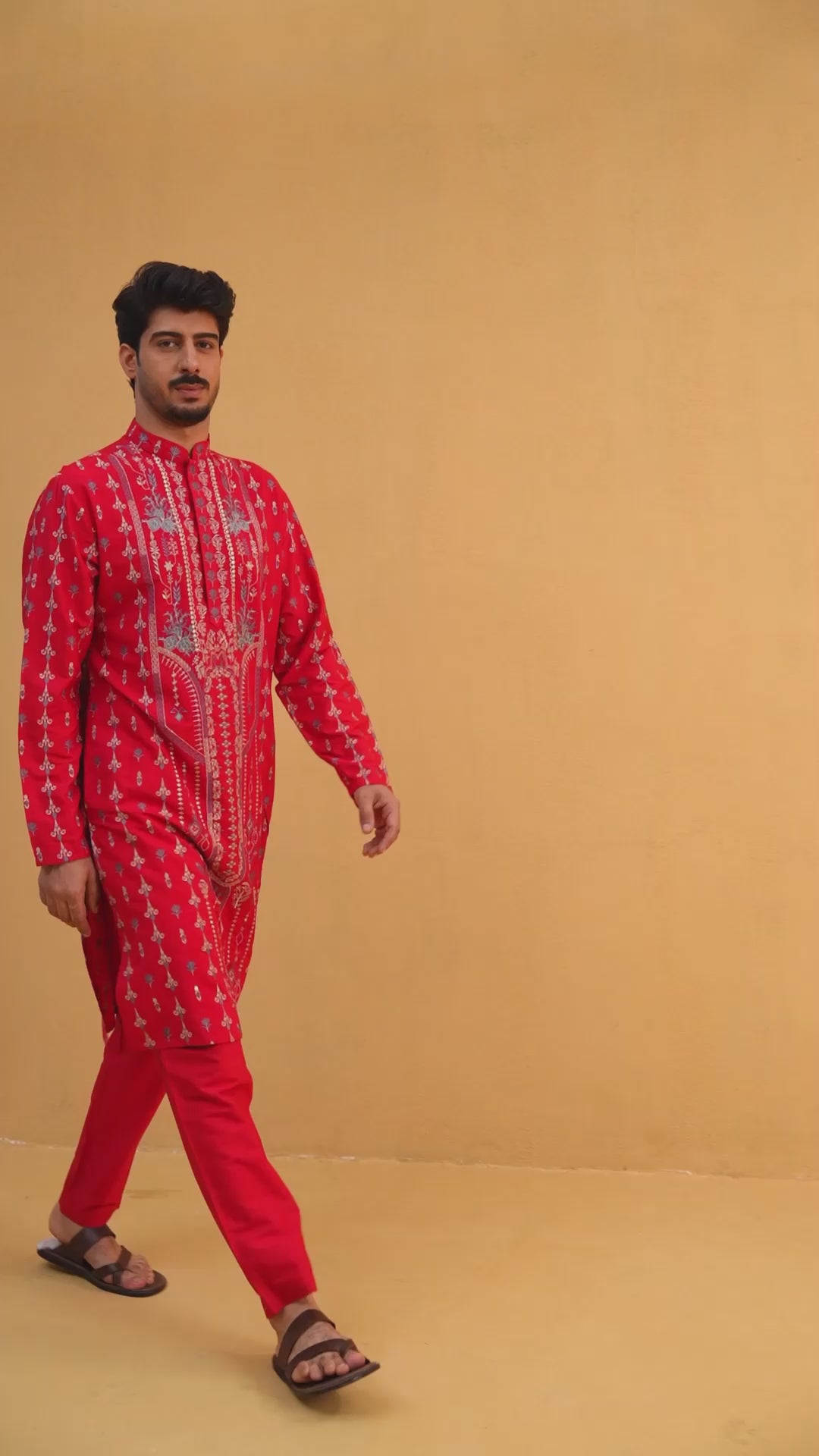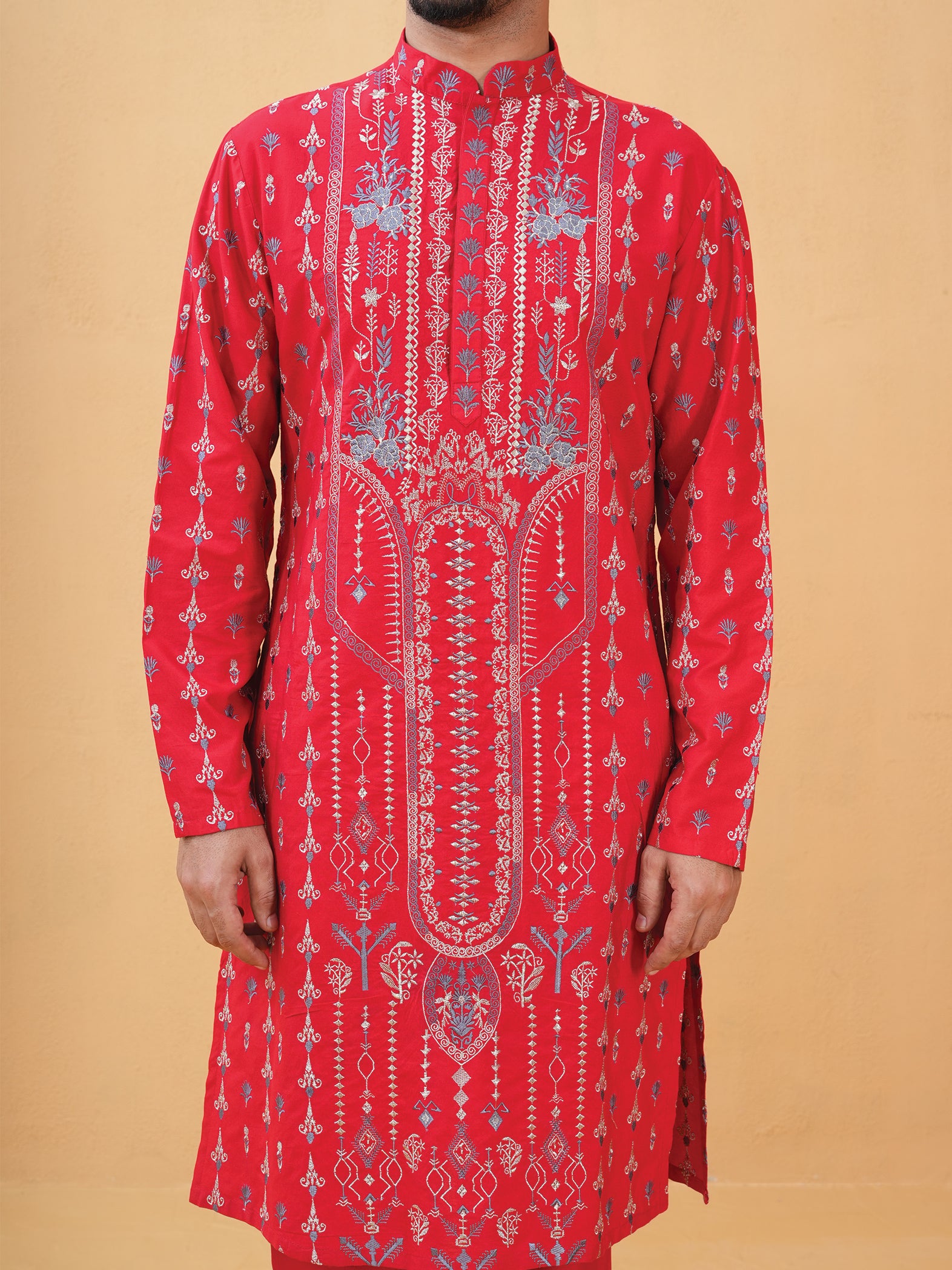 Drenched in a bold red hue, this Katan silk kurta showcases intricate embroidery that blends tradition with modern elegance.