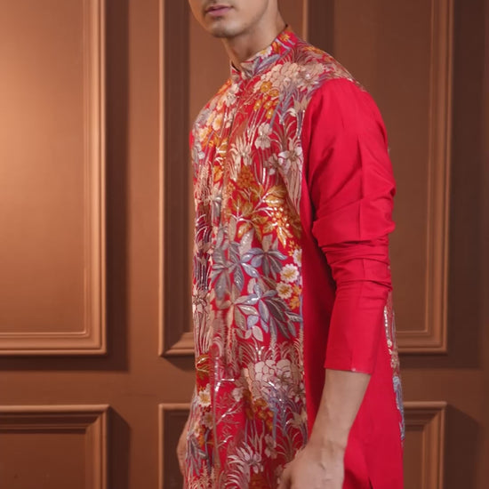 The Kavyan Red Embroidered Katan Kurta is a vibrant and regal piece, crafted in rich red Katan silk with intricate embroidery. Perfect for festive occasions and grand celebrations.