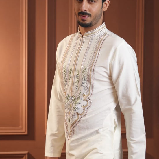 The Aarnik Ivory Embroidered Katan Kurta is a refined silhouette featuring delicate hand embroidery on lustrous Katan silk. Its understated elegance makes it a versatile choice for both intimate celebrations and formal gatherings.