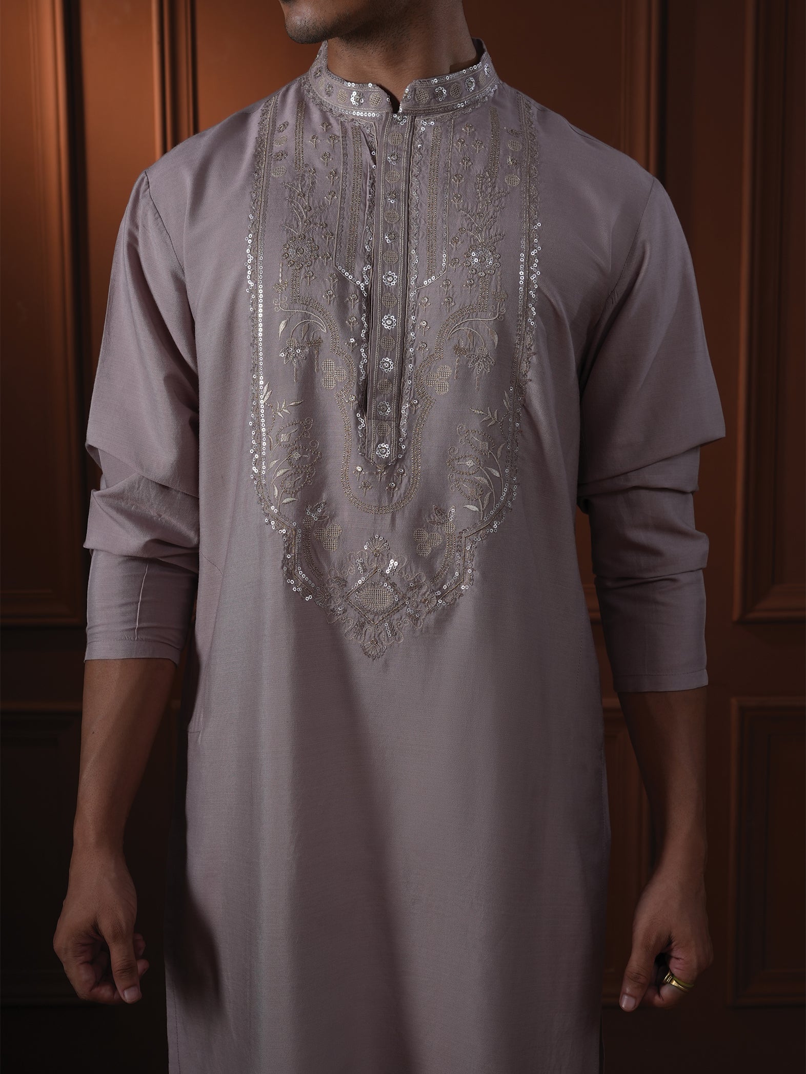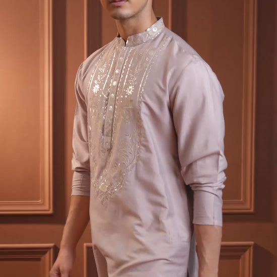 The Nitigya Mauve Embroidered Katan Kurta is a graceful piece crafted in soft mauve Katan silk, featuring delicate embroidery. Its subtle hue and refined detailing make it perfect for elegant gatherings and festive occasions.