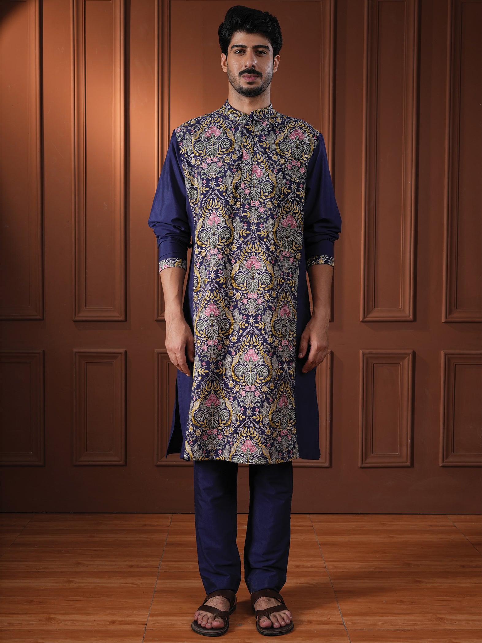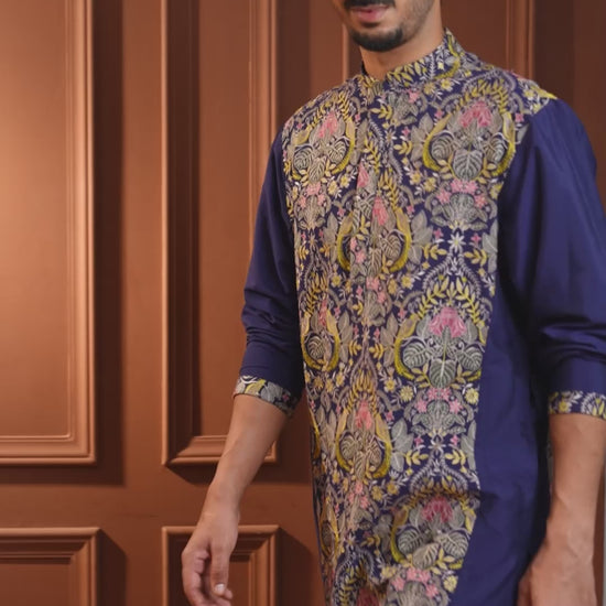 The Ketan Blue Embroidered Katan Kurta is a distinguished piece crafted in rich blue Katan silk, adorned with intricate embroidery. Perfect for festive events and elegant evening occasions.