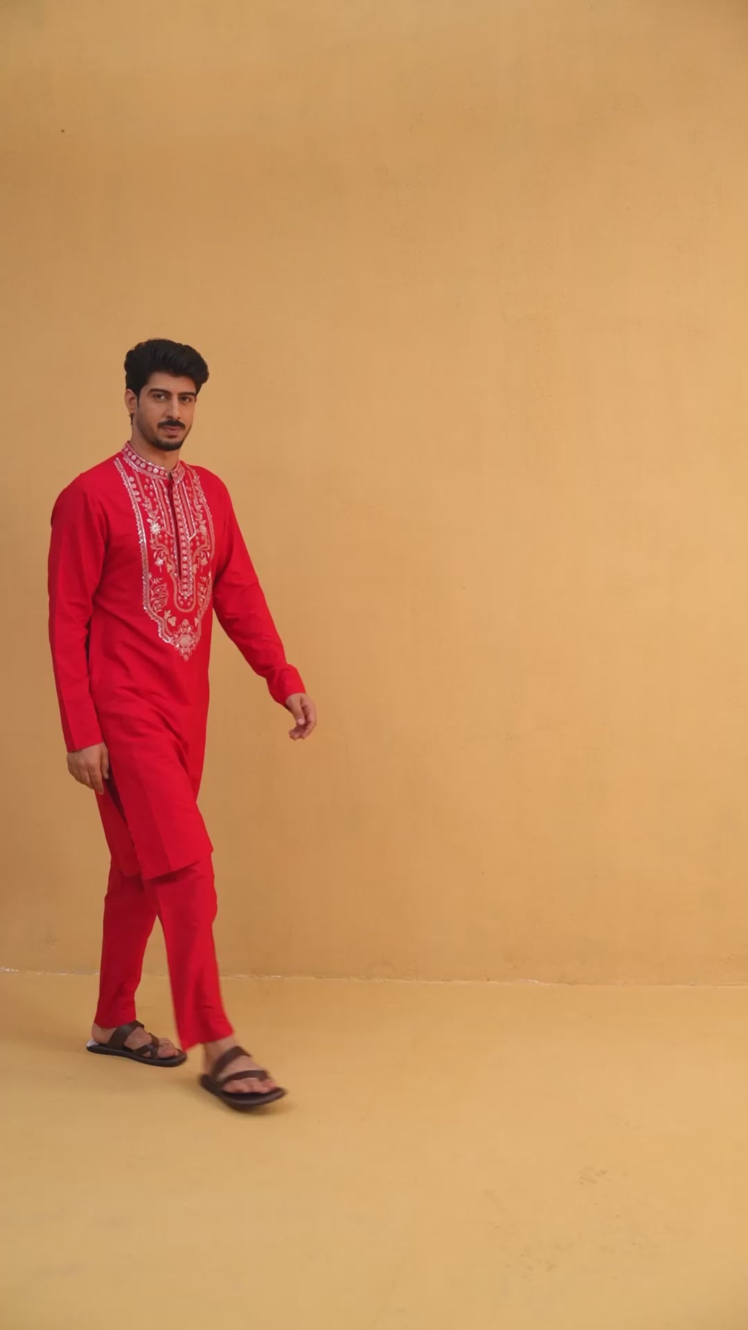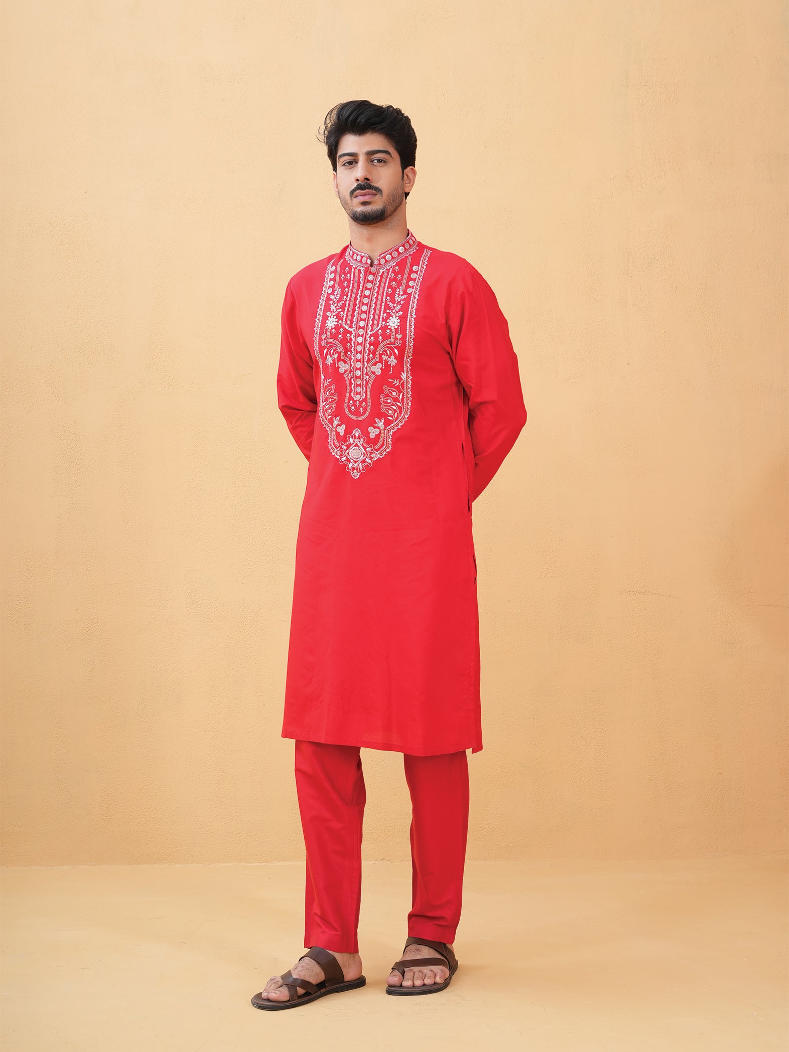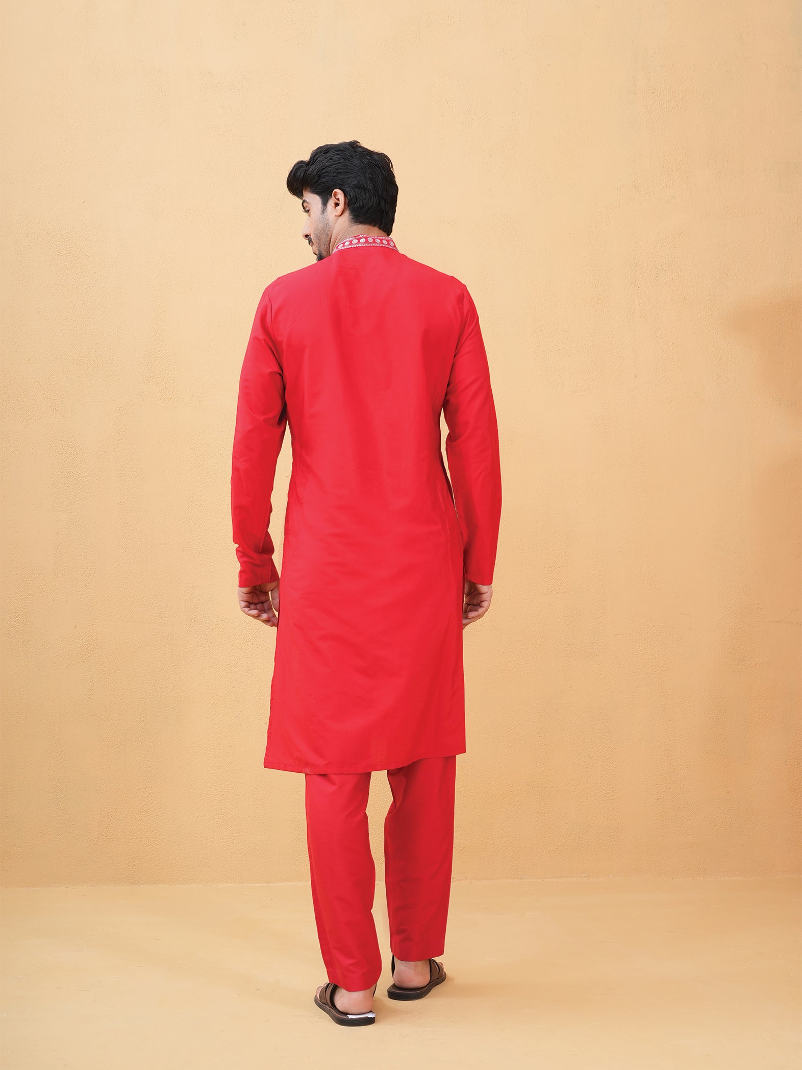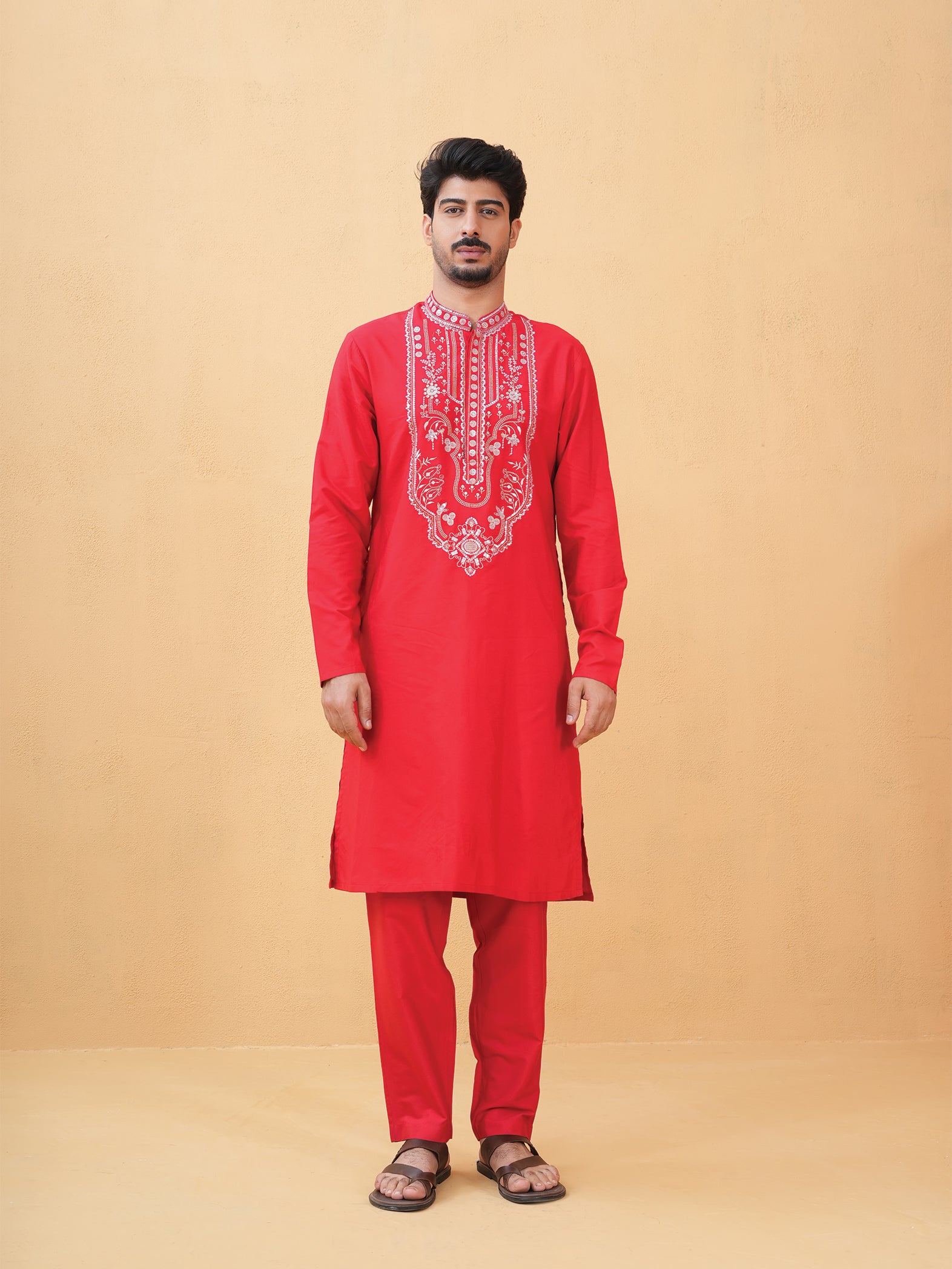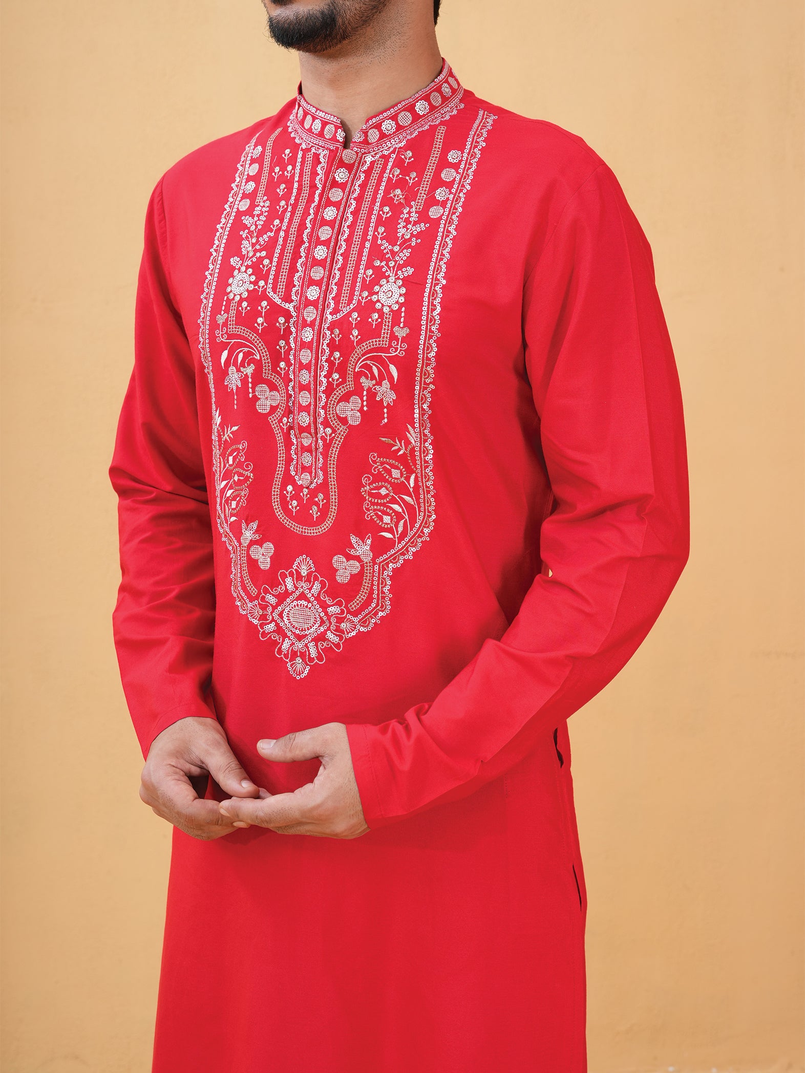 A striking red Katan silk kurta adorned with intricate embroidery for a refined statement.
