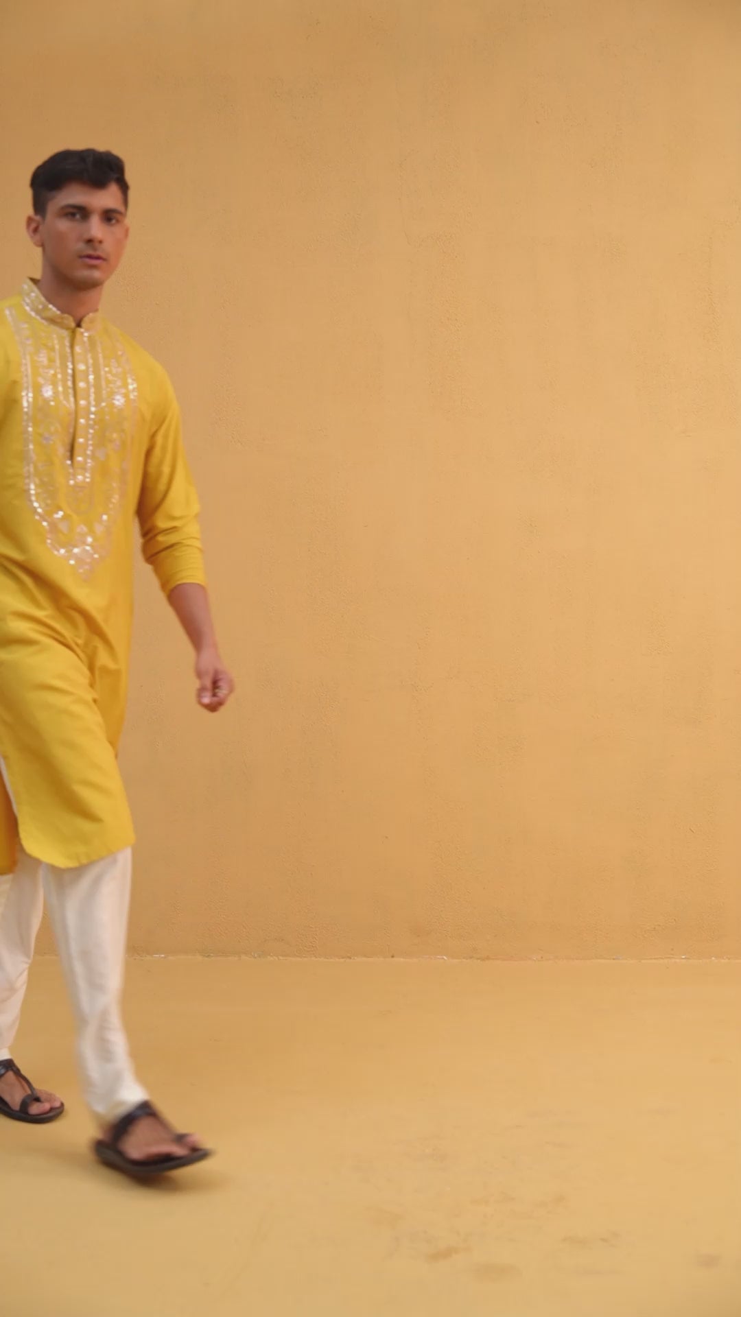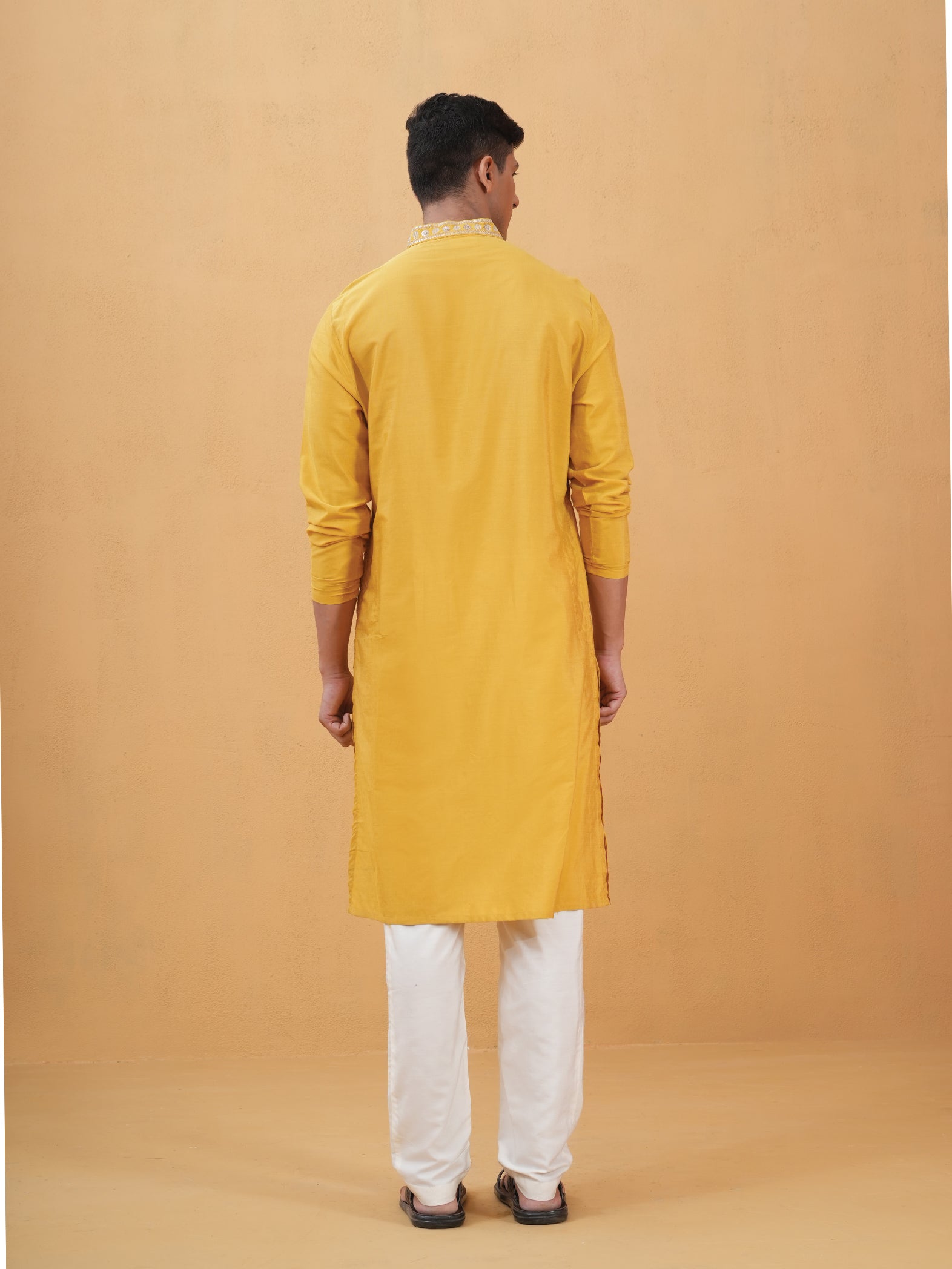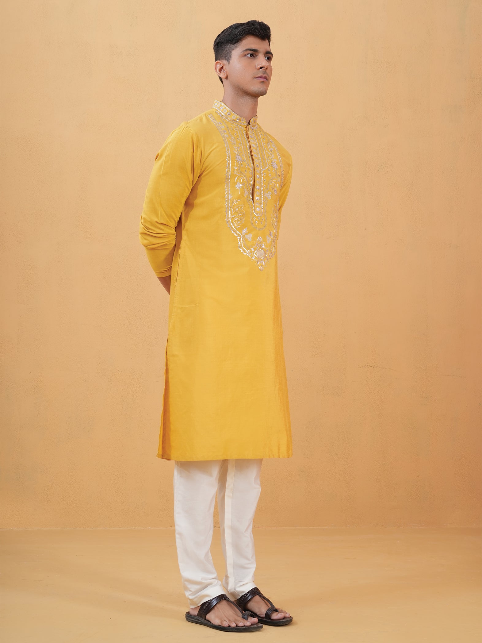 An elegant Yellow Katan silk kurta set featuring subtle tonal embroidery that celebrates refined craft.