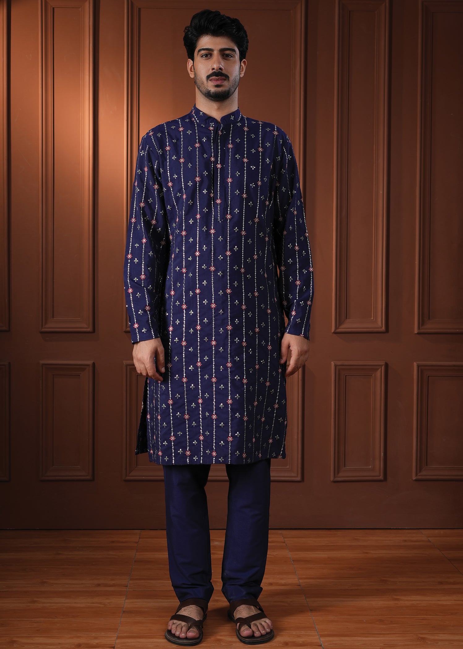 The Rahiv Blue Embroidered Katan Kurta Set pairs a beautifully embroidered kurta with matching trousers, crafted in luxurious blue Katan silk. An elegant ensemble perfect for festive celebrations and formal events.