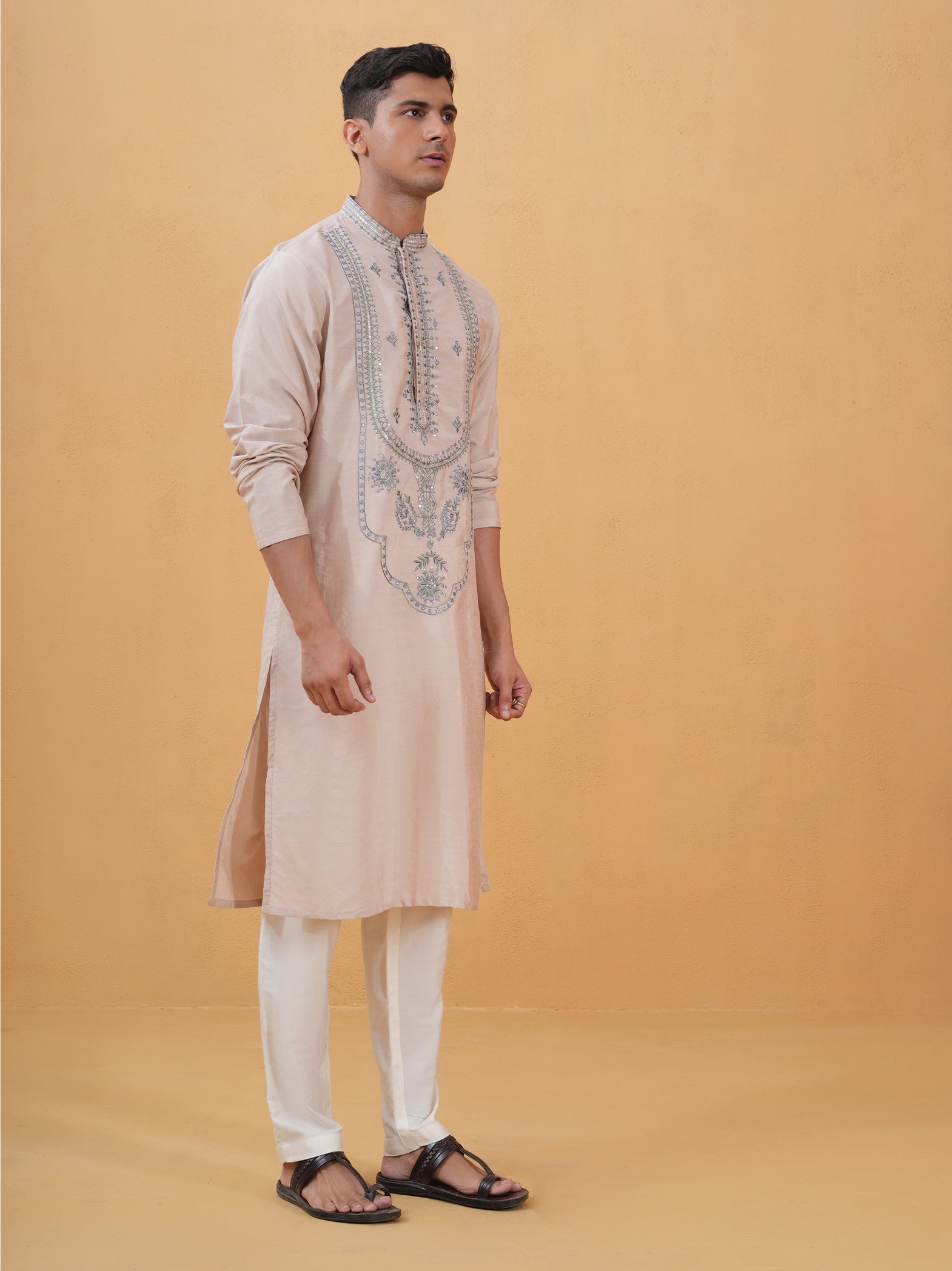 A refined peach Katan silk kurta adorned with delicate tonal embroidery for understated elegance.