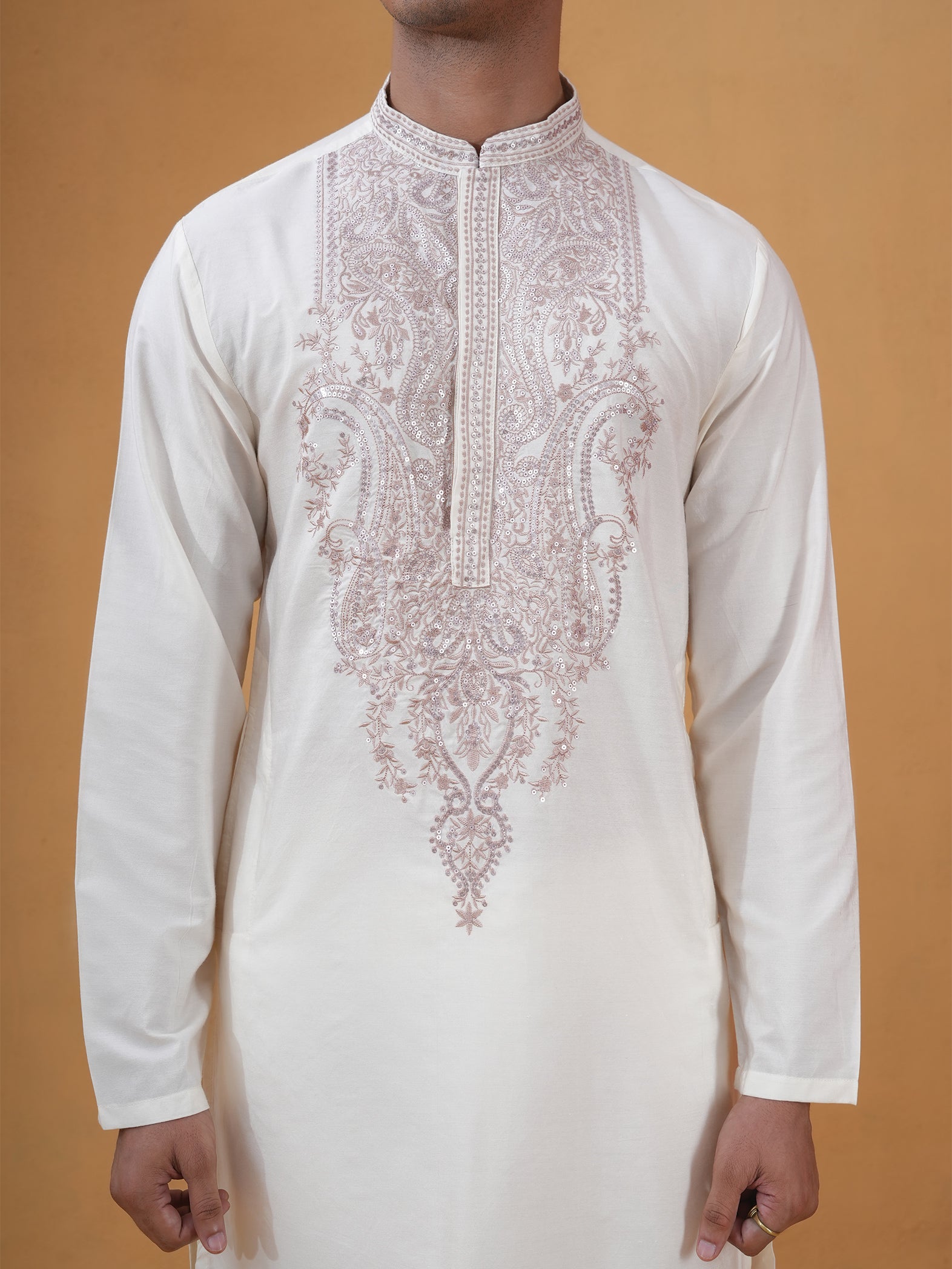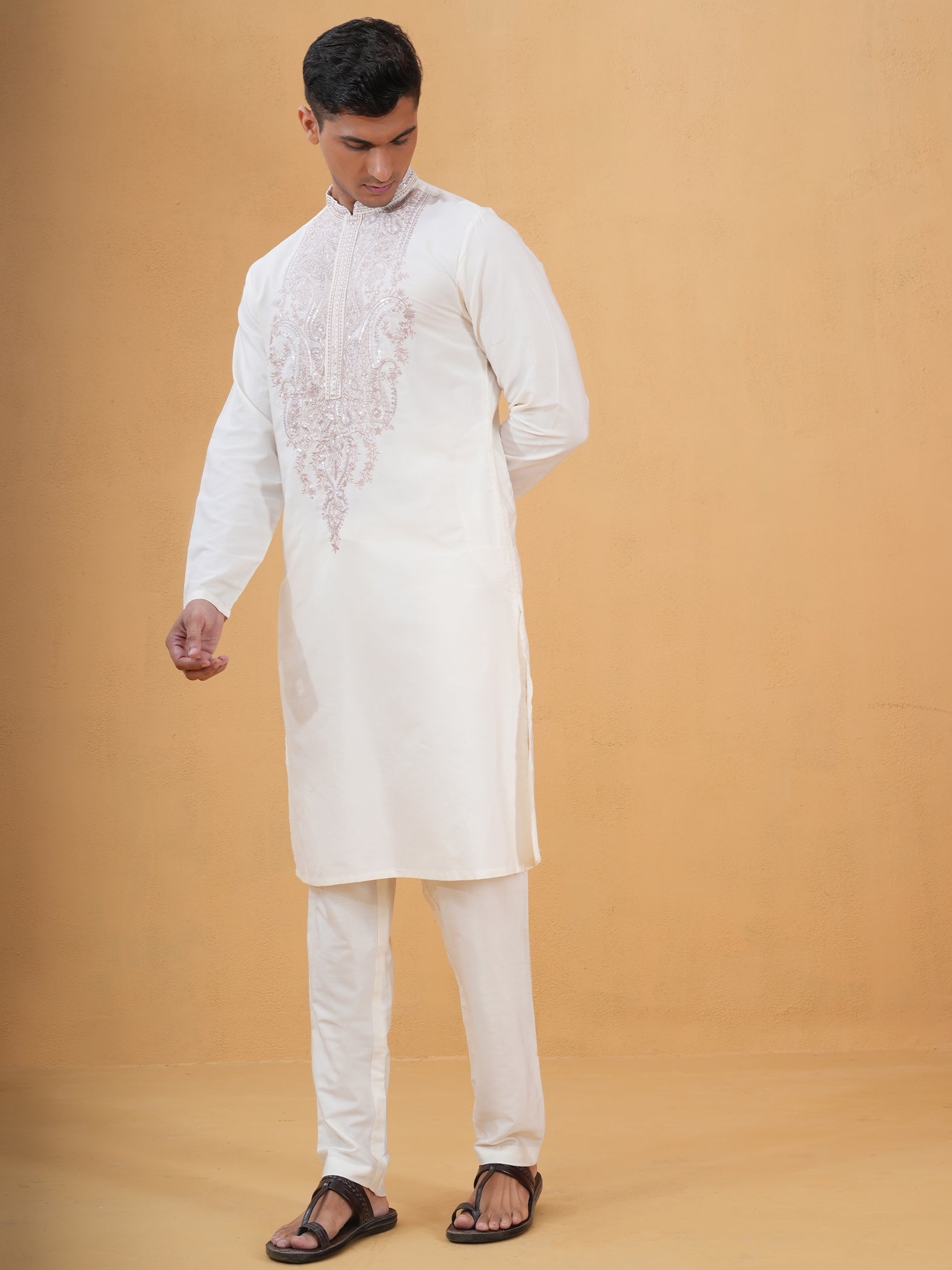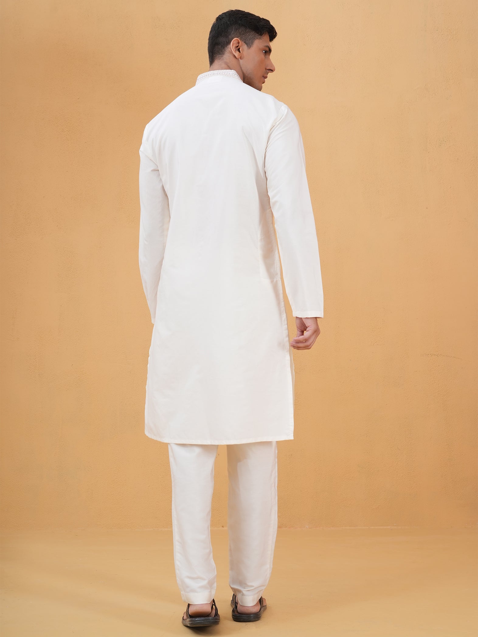 Timeless ivory kurta crafted in lustrous Katan silk for a subtle, regal statement.