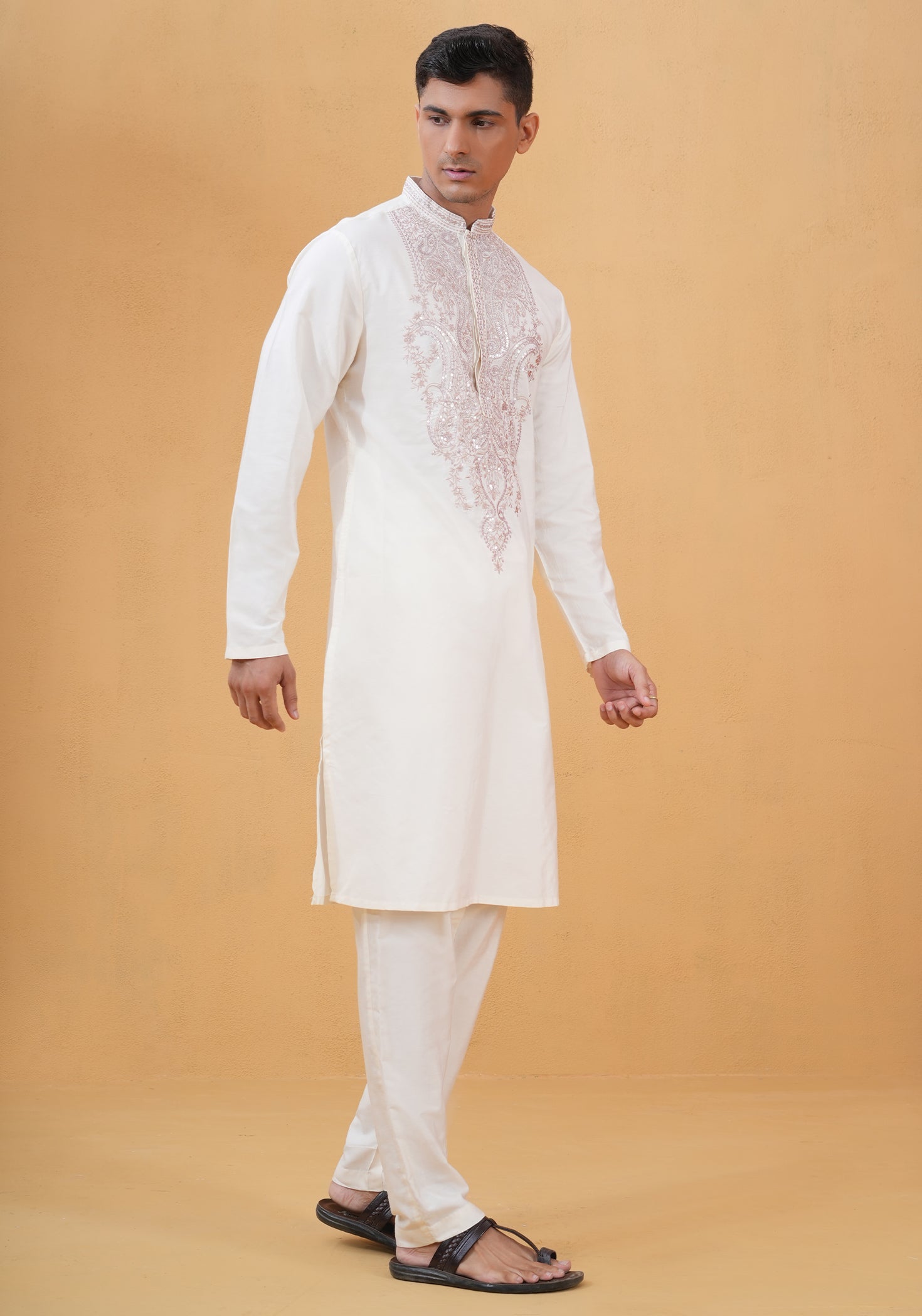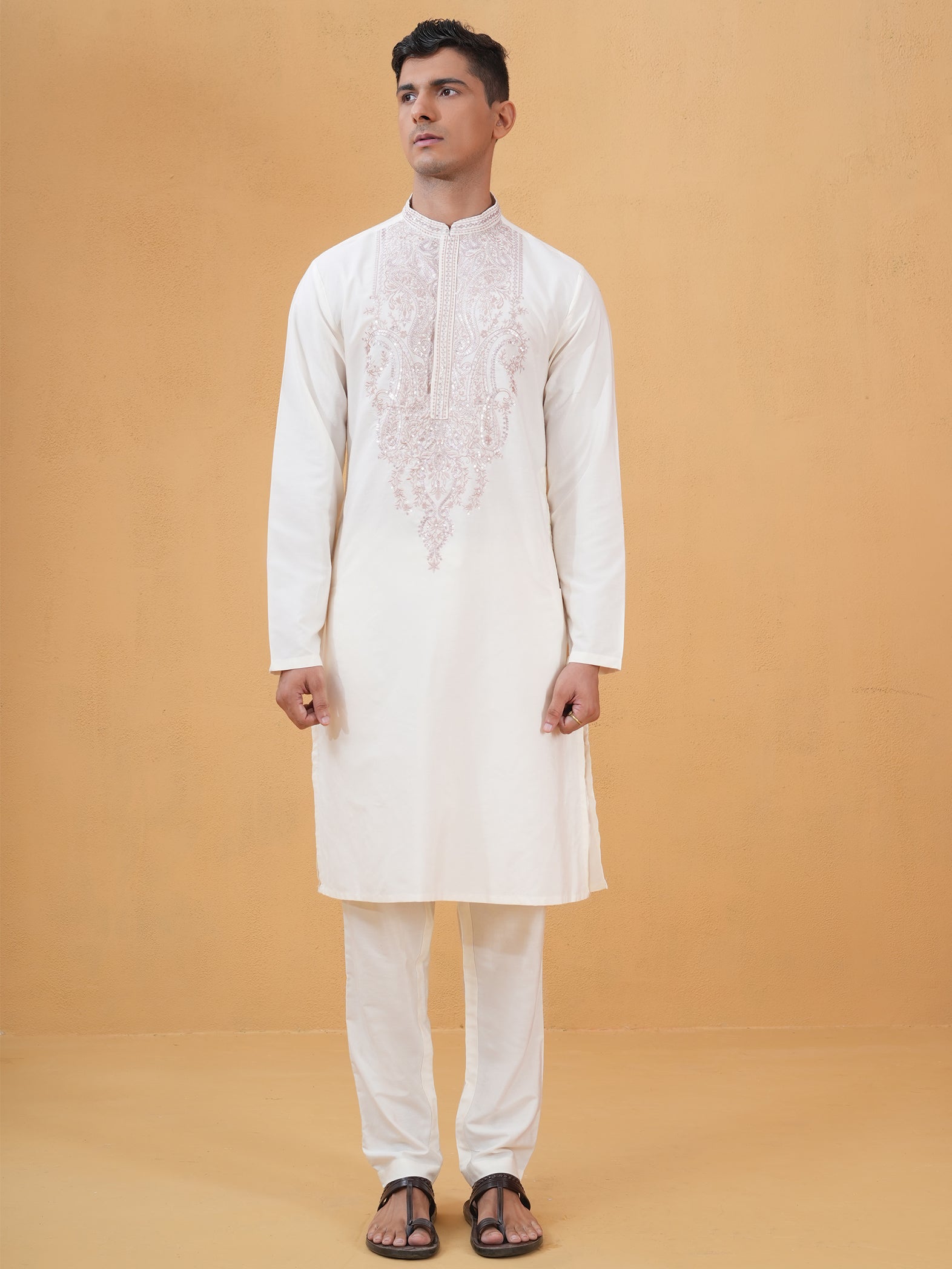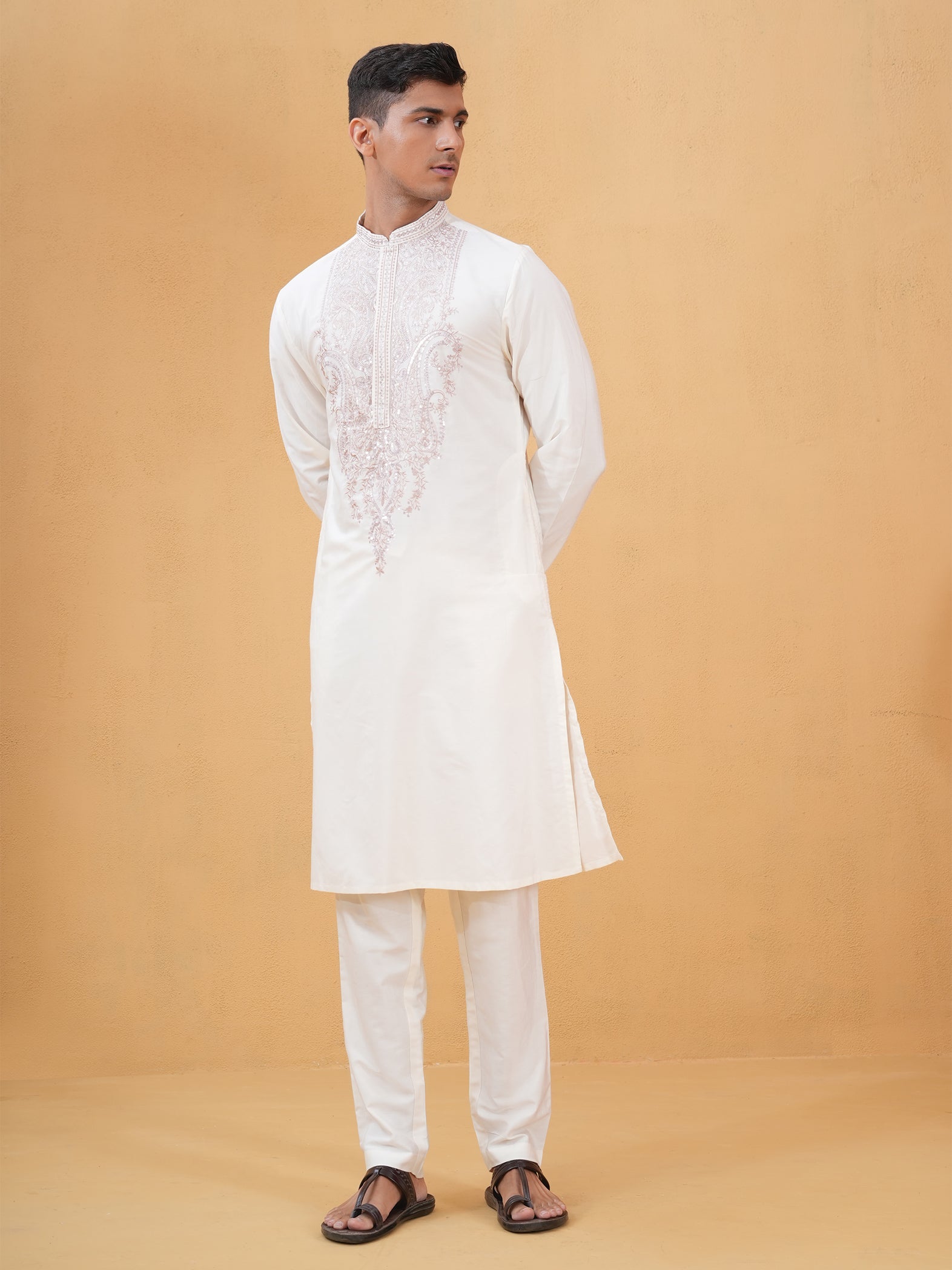 Timeless ivory kurta crafted in lustrous Katan silk for a subtle, regal statement.