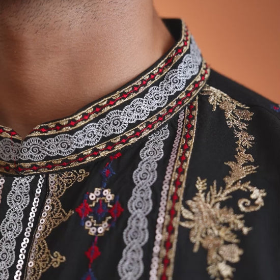The Tanvith Black Embroidered Katan Kurta is a sleek and elegant piece crafted in rich black Katan silk, detailed with intricate embroidery. Perfect for evening events and sophisticated celebrations.